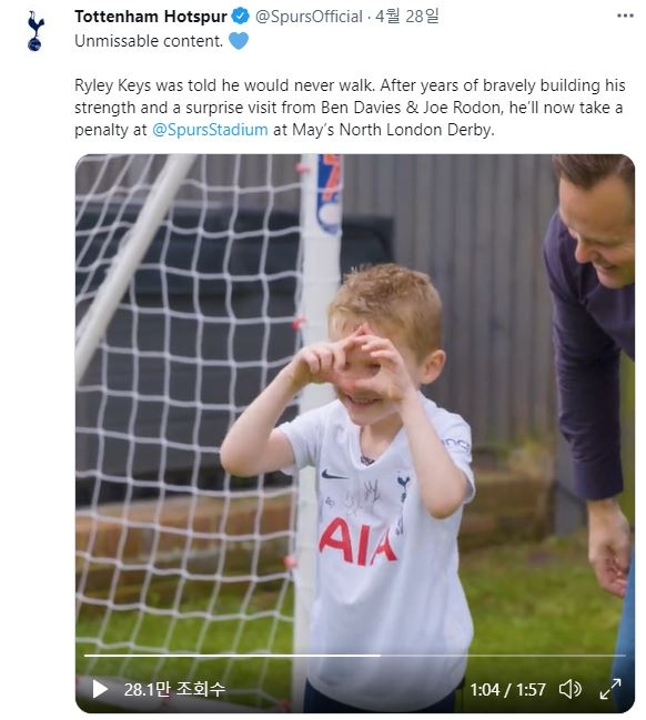 토트넘 구단은 최근 소속 선수인 벤 데이비스와 조 로든이 라일리를 찾아가 함께 시간을 보낸 영상을 공개했다.