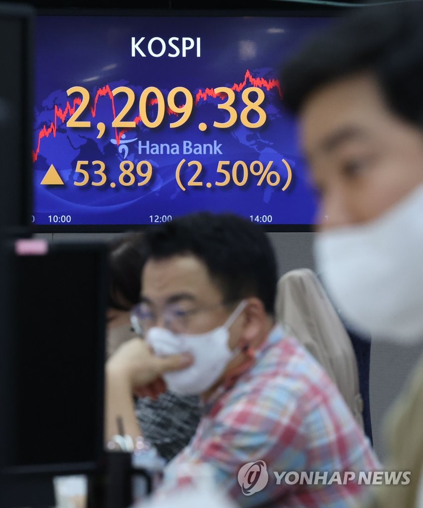 | ▲ An electronic signboard in the dealing room of Hana Bank in Seoul on Oct. 4, 2022, shows the benchmark Korea Composite Stock Price Index (KOSPI) having gained 53.89 points, or 2.50 percent, to close at 2,209.38. South Korean stocks made a strong rebound from more than a two-year low as investors picked up battered tech shares following solid gains on Wall Street. (Yonhap) |