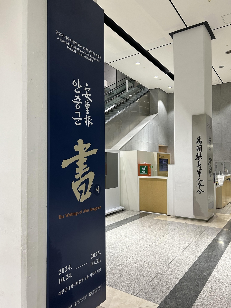 | ▲ 안중근 의사를 기념하며 (서울=연합뉴스) 김예나 기자 = 지난 22일 서울 종로구 대한민국역사박물관 1층 로비에 안중근 의사의 하얼빈 의거 115주년 기념 특별전 '안중근 서(書)' 안내물이 설치돼 있다. 2024.10.23 yes@yna.co.kr |