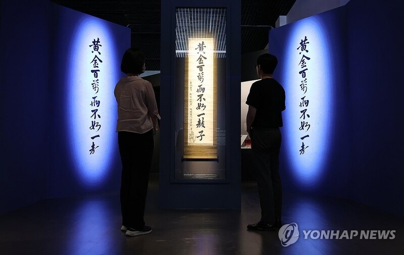 | ▲ '황금백만냥 불여일교자' 유묵 황금이 백만 냥이라도 자식에게 하나를 가르침만 못하다는 뜻을 담은 글씨 [대한민국 역사박물관 제공. 재판매 및 DB 금지] |