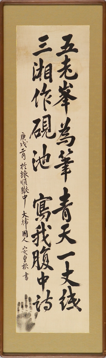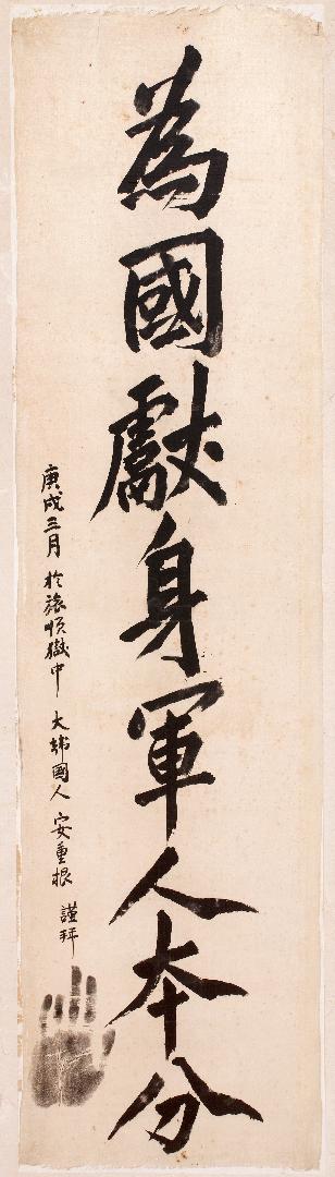 힘 있고 간결하게 쓰인 글자 옆에는 '대한국인'(大韓國人) 안중근이 썼다는 기록을 남겼다. 네 번째 손가락 일부가 없는 왼쪽 손바닥 도장과 함께였다.
