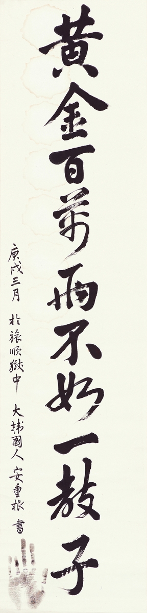1910년 3월 뤼순 감옥의 나카무라(中村) 계장에게 써줬다는 이 유묵에는 '황금백만냥 불여일교자'(黃金百萬兩 不如一敎子)라는 글씨가 쓰여 있다.