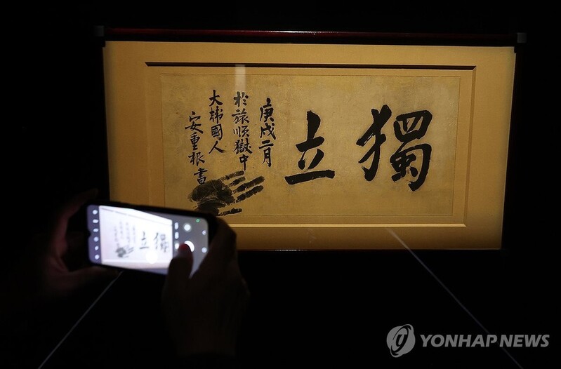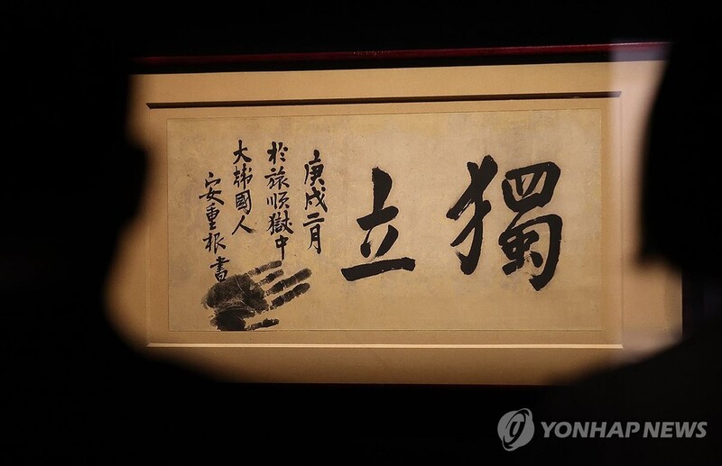 | ▲ 안중근 의사가 애타게 소망했던 독립 (서울=연합뉴스) 김성민 기자 = 23일 오후 서울 종로구 대한민국역사박물관에서 열린 안중근 의사 하얼빈 의거 115주년 기념 특별전시 '안중근 書'에 '독립'이라고 적힌 안중근 의사의 유묵이 전시돼 있다. 2024.10.23 ksm7976@yna.co.kr |