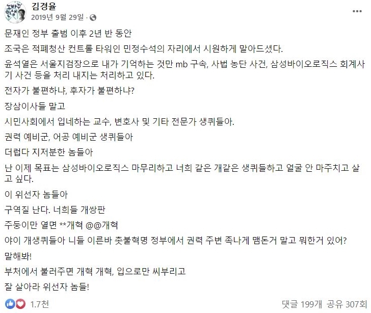 그는 조국 당시 법무부 장관 가족에 대한 검찰 수사가 진행 중이던 2019년 9월 29일 오전 6시27분, 페이스북에 329자의 글을 올렸다. 서울중앙지검과 대검찰청이 있는 서초동에서는 '조국 수호'와 '검찰 개혁'을 내건 촛불집회가 이어지는 등 혼란이 계속되는 상황이었다.