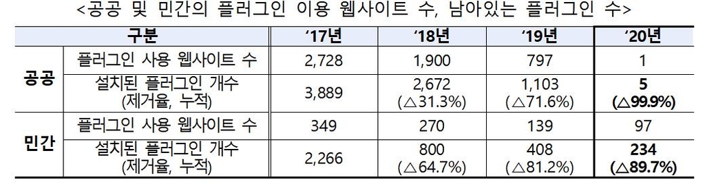 지난해 기준 플러그인을 사용해야 하는 웹사이트 개수는 공공 분야가 1개, 민간 분야가 97개였다.