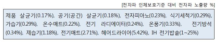 다만 순간적 가열이 필요한 헤어드라이어, IH 전기밥솥은 기준을 충족했지만, 일반 가전보다는 상대적으로 높은 전자파가 발생했다.