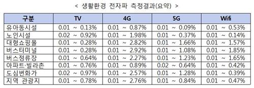 유아동·노인시설과 일반인 다중이용시설, 아파트 단지, 빌라촌, 도심 번화가 등의 전자파 노출량은 기준 대비 1~3% 수준이었다.