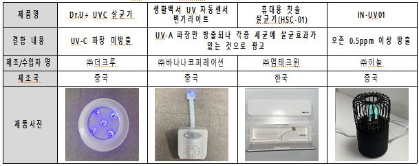 그중 1개 제품은 UV-C 파장이 나온다고 표시했지만, 자외선-A(UV-A) 파장만 방출됐다. 이 제품의 제조사인 더크루는 판매를 중지하고, 소비자가 요청하면 교환·환불을 하기로 했다.