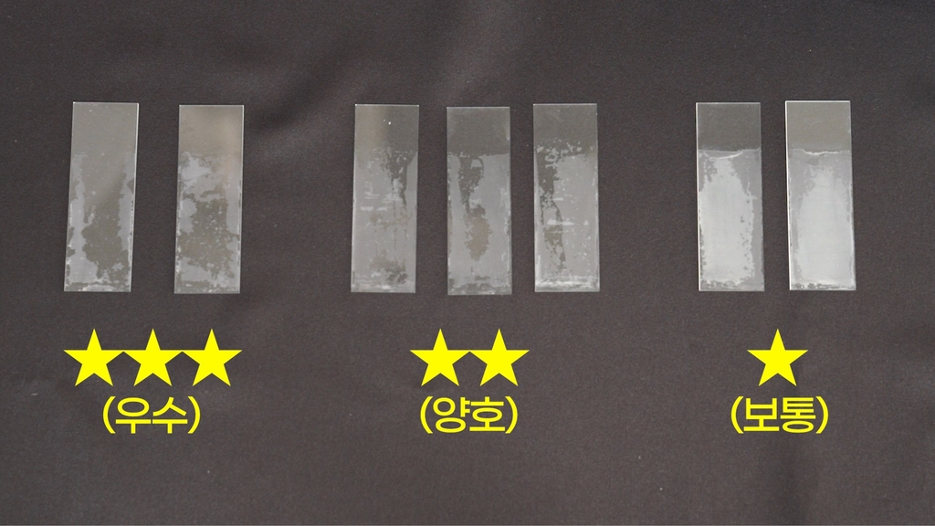 우선 손가락 크기만 한 슬라이드 유리판에 기름때를 묻힙니다. 기름때 농도는 표준화된 수치에 맞췄어요.