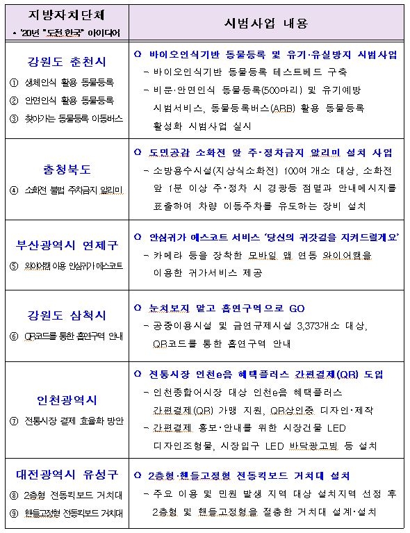 | ▲ 2020년 '도전.한국' 우수 아이디어 시범사업 선정 현황 [행정안전부 제공. 재판매 및 DB 금지] |