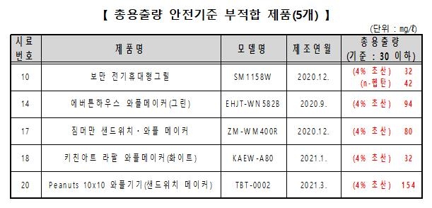 | ▲ 총용출량 안전기준 부적합 제품 [한국소비자원 보도자료 캡처. 재판매 및 DB 금지] |