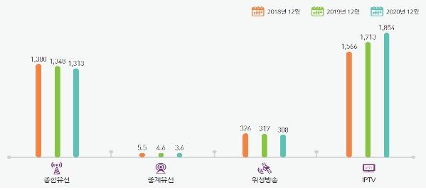 사업자 유형별 가입자 수는 IPTV 1천854만 단자(8.2%↑), SO 1천313만 단자(2.6%↓), 위성방송 308만 단자(2.7%↓) 등이었다.