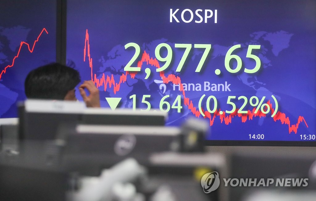 | ▲ Electronic signboards at a Hana Bank dealing room in Seoul show that the benchmark Korea Composite Stock Price Index (KOSPI) closed at 2,977.65 on Dec. 30, 2021, the last day of stock trading for the year, down 15.64 points, or 0.52 percent, from the previous session. (Yonhap) |