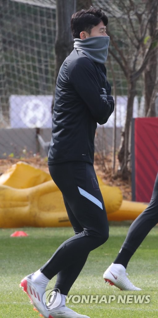 장갑까지 낀 손흥민은 넥워머를 광대뼈까지 끌어올리고 조규성(김천), 김진수(전북), 황희찬(울버햄프턴) 등과 함께 몸을 풀었다.