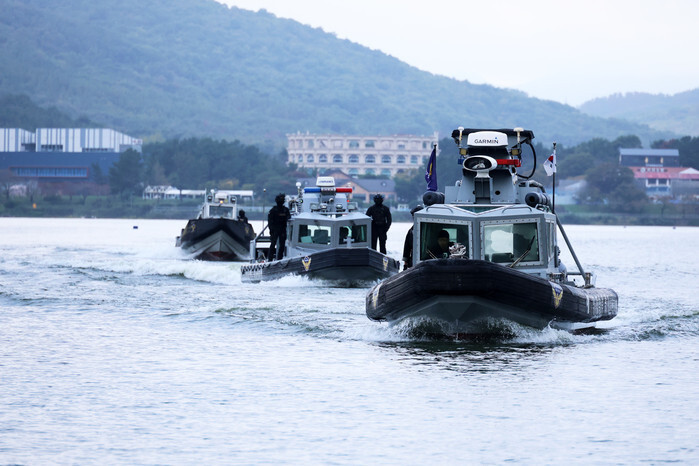 South Korean Coast Guard patrol boats conduct a drill on Bomun Lake in Gyeongju, North Gyeongsang Province, southeastern South Korea, on Oct. 15, 2025, as South Korea heightens security ahead of a series of Asia-Pacific Economic Cooperation forum meetings. An APEC CEO Summit is set for Oct. 29-31 in the run-up to the APEC summit from Oct. 31-Nov. 1 in the city. (Yonhap)