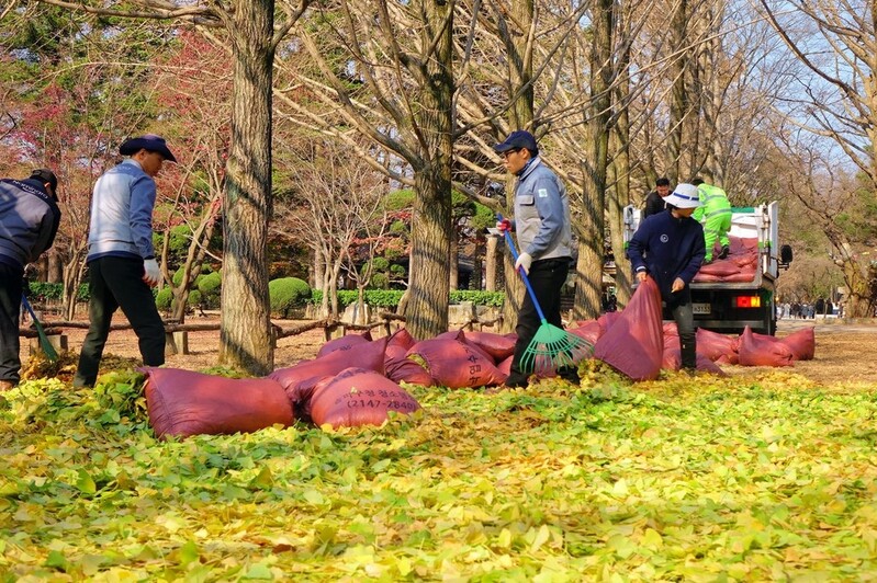 | ▲ 서울 송파구 은행나무 뿌리는 남이섬 직원 [남이섬 제공.재판매 및 DB 금지] |