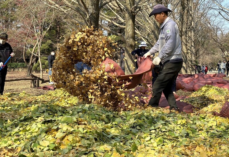 15일 남이섬에 따르면 이날 송파구에서 약 5t의 은행잎을 가져와 섬 내 '송파은행나무길'에 뿌렸다.