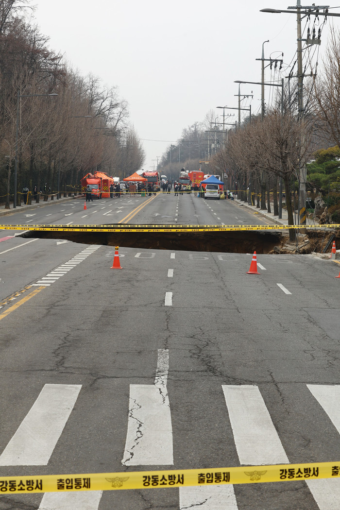 This photo, taken March 25, 2025, shows the site of a sinkhole, 20 meters wide and 18 meters deep, at an intersection in Seoul's Gangdong Ward, one day after it opened and swallowed a motorcyclist. (Yonhap)