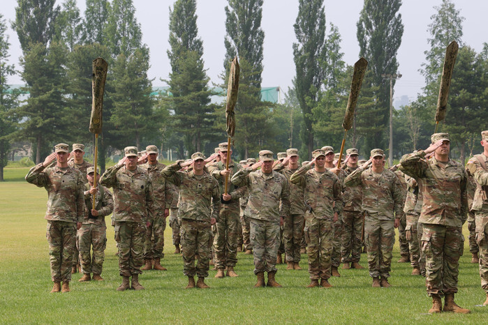 Soldiers from the 1st Stryker Brigade Combat Team of the 4th Infantry Division, employing the Stryker fighting vehicle, take part in a ceremony at Camp Casey in Dongducheon, 41 kilometers north of Seoul, on June 18, 2025, marking the official transfer of authority from the outgoing 1st Stryker Brigade Combat Team of the 7th Infantry Division. (Yonhap)