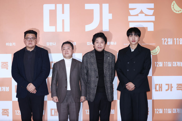 The stars of the new movie "About Family" -- Park Soo-young, Kim Yoon-seok and Lee Seung-ki (2nd L to R) -- along with director Yang Yoo-seok (L) -- pose for a photo during an event in Seoul on Nov. 21, 2024, to promote the movie, set to hit local screens in South Korea on Dec. 11. (Yonhap)