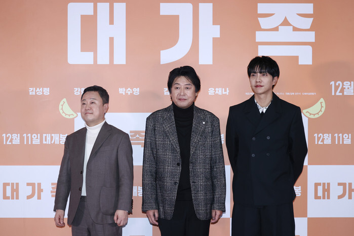 The stars of the new movie "About Family" -- Park Soo-young, Kim Yoon-seok and Lee Seung-ki (L to R) -- pose for a photo during an event in Seoul on Nov. 21, 2024, to promote the movie, set to hit local screens in South Korea on Dec. 11. (Yonhap)