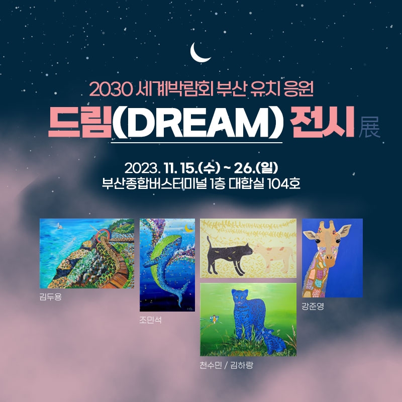 부산시설공단은 오는 26일까지 부산종합버스터미널 1층 대합실에서 '2030부산엑스포 유치 응원 드림(DREAM·꿈) 전시전'을 개최한다고 16일 밝혔다.