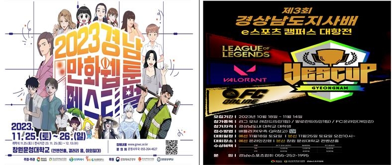 매년 4천명 이상이 참여하는 문화콘텐츠 행사인 '경남 만화웹툰 페스티벌'은 25∼26일 창원문성대학교에서, 경남도지사배 이스포츠 캠퍼스 대항전은 오는 18일 온라인 예선전을 거쳐 25일 창원문성대학교에서 결선을 한다.