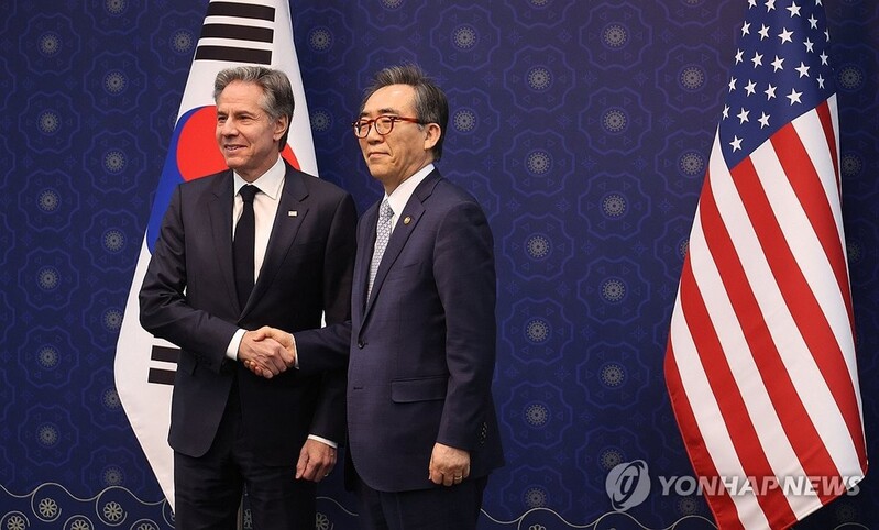 | ▲ Foreign Minister Cho Tae-yul (R) poses with U.S. Secretary of State Antony Blinken during their talks at Seoul's foreign ministry, in this March 18, 2024, file photo. (Pool photo) (Yonhap) |