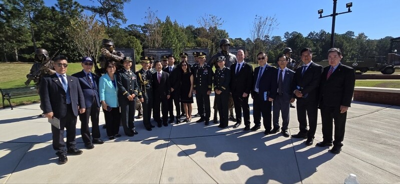 | ▲ South Korean officials, family members of late Korean War hero Gen. Paik Sun-yup and others pose for a photo as they gather for an event celebrating the installation of the Korean War Memorial at the National Infantry Museum in Columbus, Georgia, on Oct. 24, 2024, in this photo provided by South Korea's defense logistics attache Col. Kim Yong-sun. (PHOTO NOT FOR SALE) (Yonhap) |