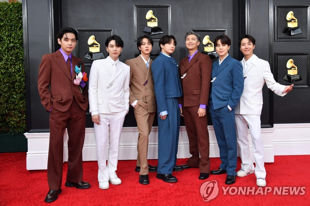 | ▲ 그래미 시상식장 도착해 포즈 취하는 BTS (라스베이거스 AFP=연합뉴스) 그룹 방탄소년단(BTS)이 3일(현지시간) 미국 라스베이거스의 MGM 그랜드 가든 아레나에 마련된 제64회 그래미 시상식장에 도착해 포즈를 취하고 있다. 2022.4.4 alo95@yna.co.kr |