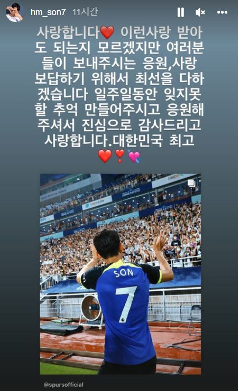 손흥민은 16일 수원월드컵경기장에서 열린 세비야(스페인)와 쿠팡플레이 시리즈 2차전이 끝난 뒤 자신의 사회관계망서비스(SNS)에 "사랑합니다. 이런 사랑을 받아도 되는지 모르겠지만, 여러분이 보내주시는 응원과 사랑에 보답하기 위해 최선을 다하겠다"고 썼다.