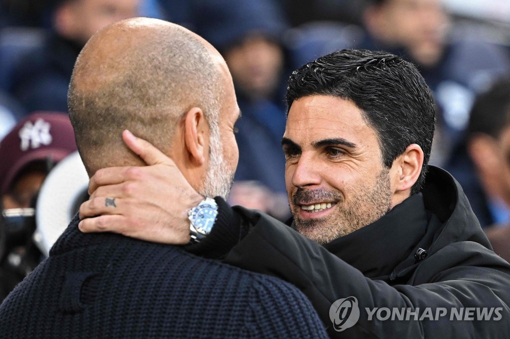 | ▲ 경기 전 과르디올라 감독과 인사하는 아르테타 감독 [AFP=연합뉴스] |