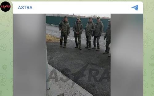 ▲ This image, captured from a video released on Telegram by Astra, an independent Russian media outlet, shows a group of soldiers believed to be North Koreans dispatched to Russia gathered at an unknown location. (PHOTO NOT FOR SALE) (Yonhap)