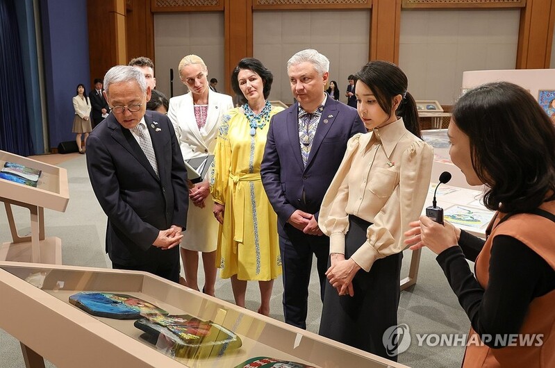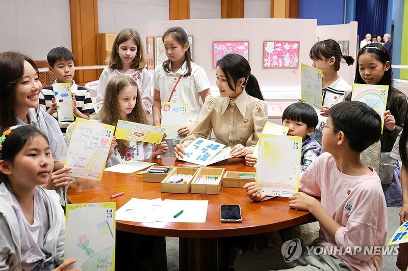 The presidential office said Kim played a role in bringing Ukrainian children's drawings to South Korea after her meeting with Ukraine's first lady, Olena Zelenska, in July 2023 as part of the NATO summit spouses' program in Lithuania.