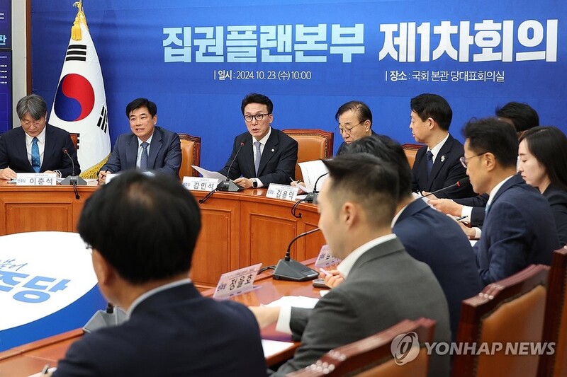 | ▲ 민주당 '집권플랜본부' 첫 회의 (서울=연합뉴스) 김주성 기자 = 더불어민주당 집권플랜본부 총괄본부장인 김민석 최고위원이 23일 오전 서울 여의도 국회에서 집권플랜본부 제1차회의를 주재하고 있다. 2024.10.23 utzza@yna.co.kr |