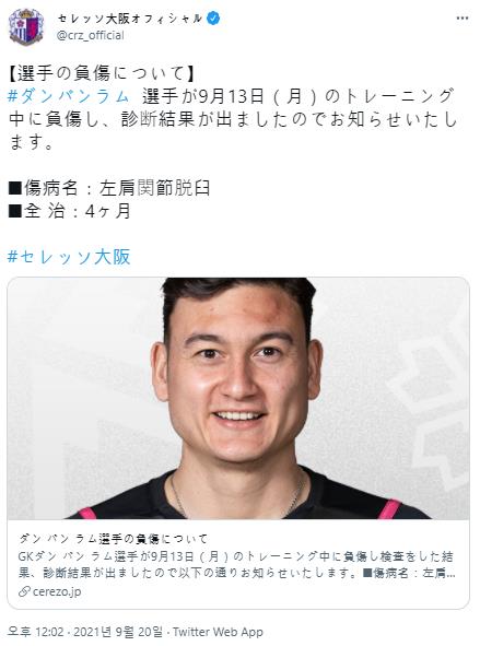 | ▲ 당반람의 부상 소식을 알린 감바 오사카 [감바 오사카 트위터 캡처. 재판매 및 DB 금지] |