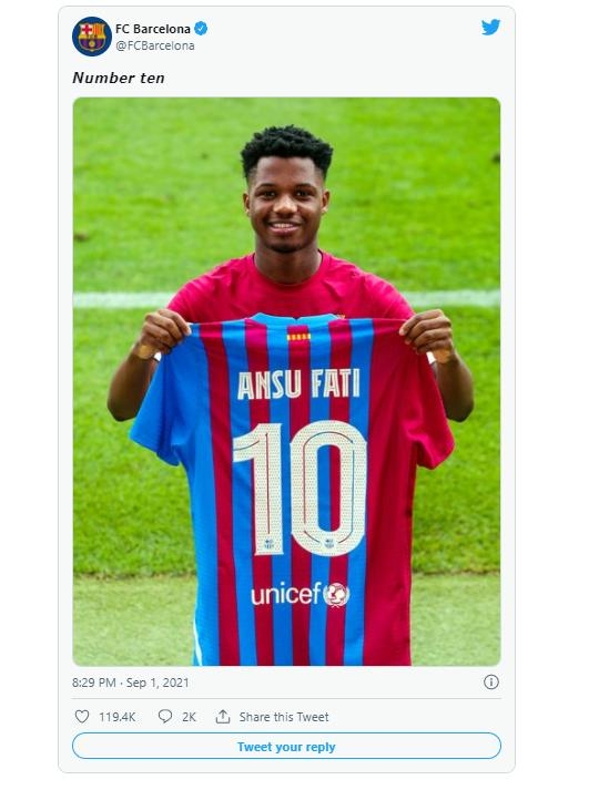 바르셀로나는 1일(현지시간) "파티가 등번호 10번을 물려받는다"면서 "22번과 17번을 달았던 젊은 스트라이커는 그동안 메시, 호나우지뉴, 히바우두 같은 전설들이 달아 유명한 바르셀로나의 10번 유니폼을 입는다"고 발표했다.