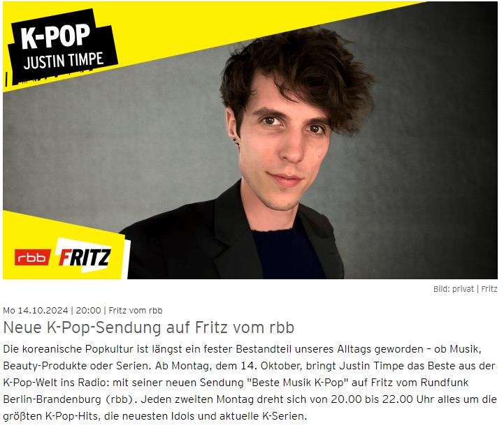 독일 공영 rbb의 음악전문 채널 프리츠 라디오는 오는 14일부터 격주로 월요일 오후 8∼10시 K팝 히트곡과 아이돌, K드라마 등을 다루는 '베스트 뮤직 K팝'(Beste Musik K-pop) 프로그램을 방송한다.