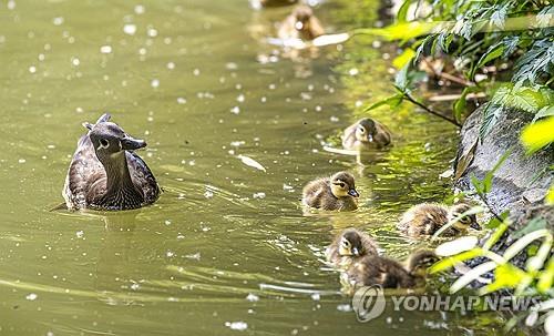 (남원=연합뉴스) 23일 전북 남원시 광한루원 연못에서 새끼 원앙들이 어미를 따라 한가롭게 헤엄을 치고 있다.