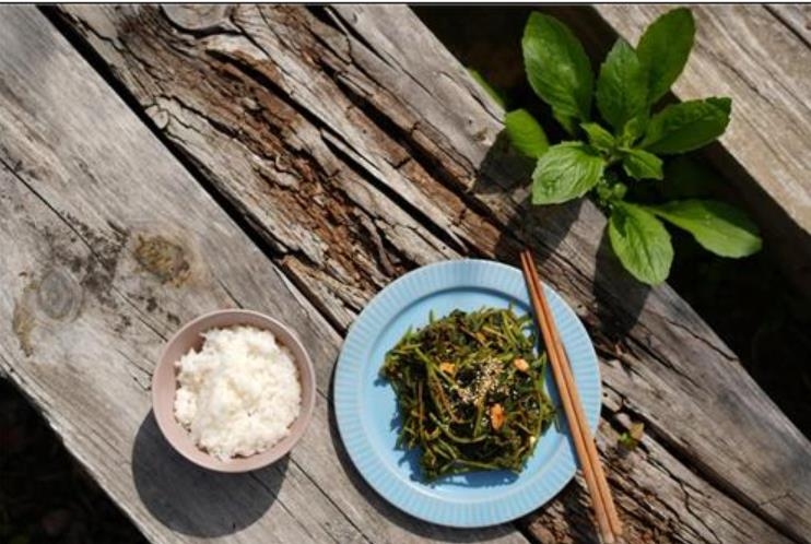 파릇파릇한 색상의 톡 쏘는 맛을 내는 엄나무 순은 지친 여행자들에겐 더없이 반가운 음식이다.