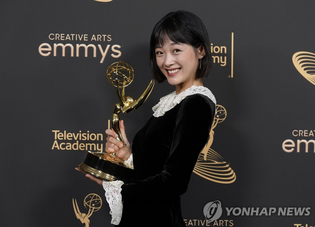 | ▲ '오징어 게임' 이유미, 美 에미상 게스트상 수상 (로스앤젤레스 AP=연합뉴스) 넷플릭스 시리즈 '오징어 게임'에 출연한 배우 이유미가 4일(현지시간) 미국 로스앤젤레스 마이크로소프트 극장에서 열린 제74회 크리에이티브 아츠 프라임타임 에미상(Creative Arts Primetime Emmy Awards)에서 게스트상(단역상)을 수상한 뒤 트로피를 들고 있다. 2022.09.05 ddy04002@yna.co.kr |