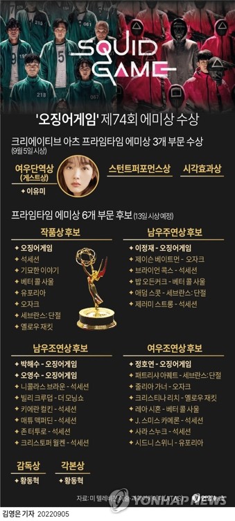 (서울=연합뉴스) 오명언 기자 김우진 인턴기자 = 한국 드라마 '오징어 게임'이 미국 방송계 최고 권위상으로 꼽히는 에미상 시상식에서 스태프 부문 수상에 성공하며 주요 부문인 작품상, 연기상 등도 거머쥘 수 있을지 기대를 모은다.