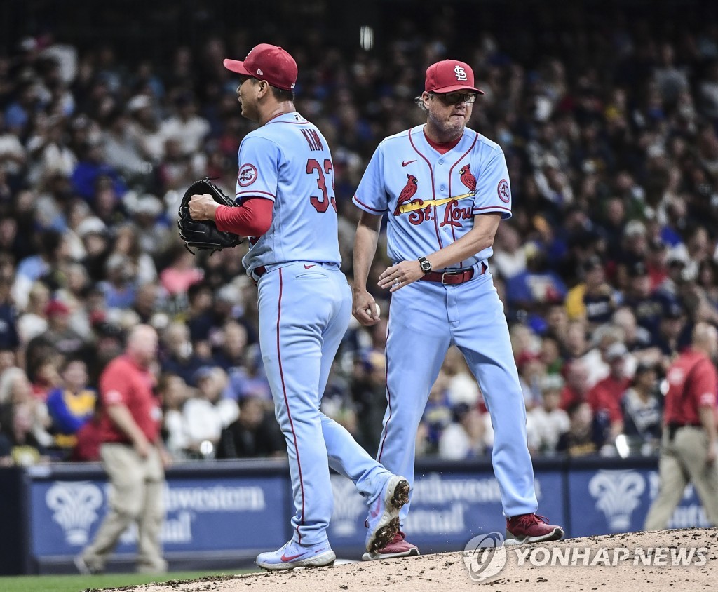 | ▲ In this USA Today Sports photo via Reuters, St. Louis Cardinals manager Mike Shildt (R) removes starter Kim Kwang-hyun in the bottom of the second inning of a Major League Baseball regular season game against the Milwaukee Brewers at American Family Field in Milwaukee on Sept. 4, 2021. (Yonhap) |