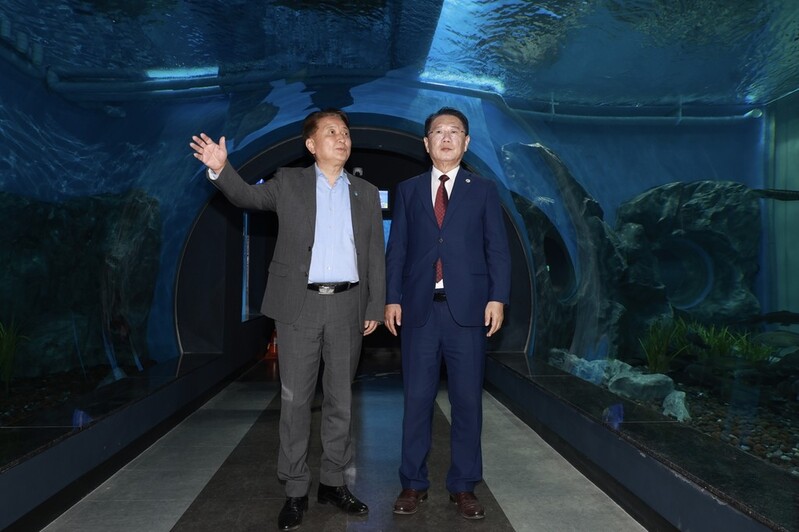 | ▲ 270도 수중 터널 관람하는 김영환(왼쪽) 충북지사와 송인헌 괴산군수 [충북도 제공. 재판매 및 DB 금지] |