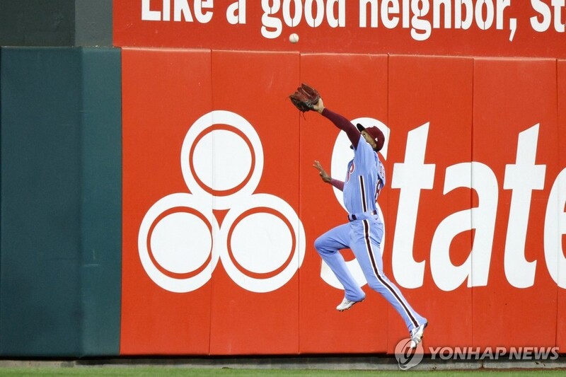 | ▲ 2사 만루에서 아쿠냐 주니어의 타구를 잡아내는 필라델피아 중견수 로하스 [EPA=연합뉴스] |
