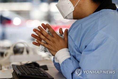 | ▲ A medical worker warms her hands with an instant hot pack at a makeshift COVID-19 testing station in Seoul on Oct. 17, 2021, amid a cold wave throughout the country. (Yonhap) |