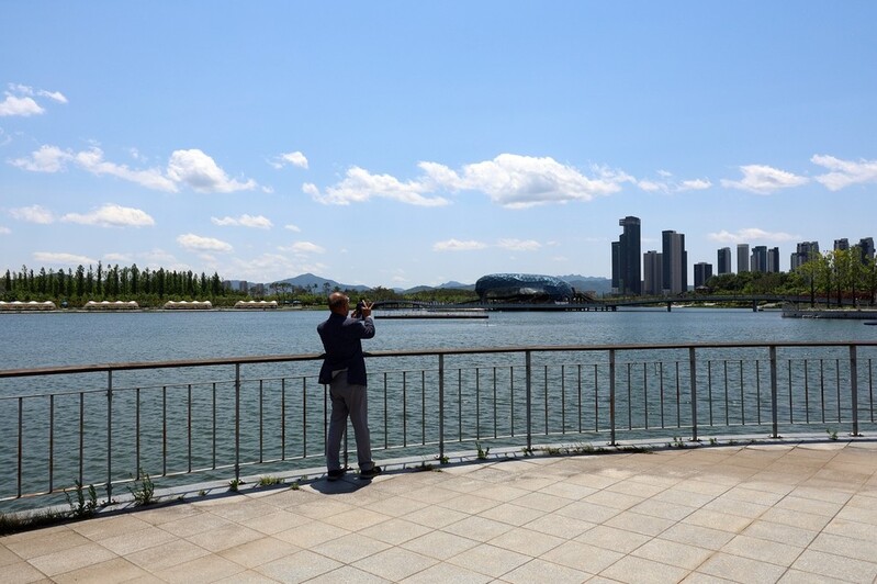 | ▲ 세종호수공원 찾은 시민 (세종=연합뉴스) 이은파 기자 = 화창한 봄 날씨를 보인 16일 세종호수공원을 찾은 한 시민이 수변을 배경으로 사진을 찍고 있다. 2024.5.16 |