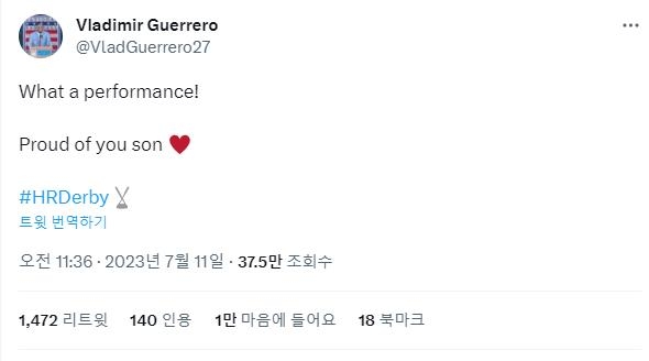'괴수'로 불린 게레로 시니어가 2007년 홈런더비에서 우승을 차지한 이래 아들 게레로 주니어가 16년 만에 홈런킹에 올라 게레로 부자는 빅리그에서 처음으로 '올스타 홈런더비 부자 우승'이라는 이정표를 수립했다.