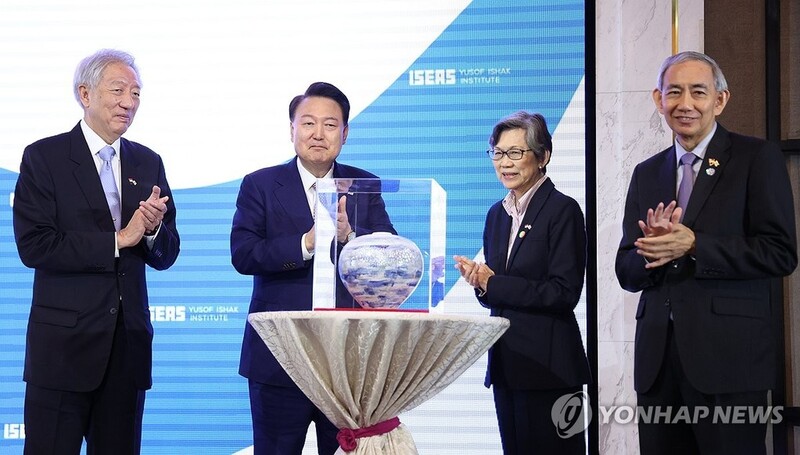 ▲ President Yoon Suk Yeol (2nd from L) receives a ceramic gift from panels of Singapore Lecture hosted by the Institute of Southeast Asian Studies in Singapore on Oct. 9, 2024. (Yonhap)
