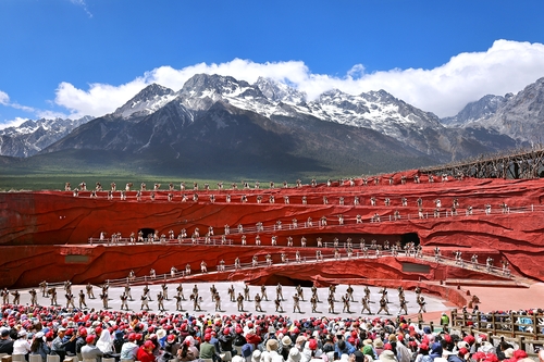 500여 명의 출연자가 소수 민족 고유 복장을 하고 무대를 채우니 옥룡설산과 멋진 조화를 만들어낸다.